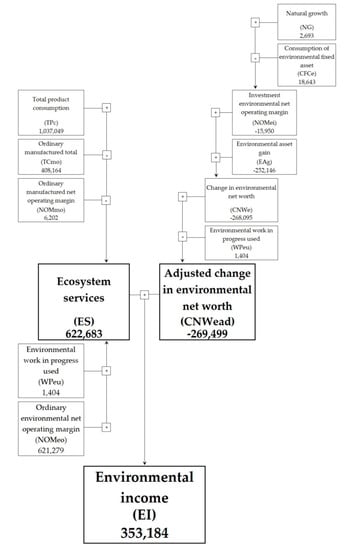 The ultimate objective of the sAAS is to measure the individual ordinary net value added (NVAo), ecosystem service (ES), change in environmental asset (CEA), adjusted change in environmental net worth (CNWead), and the environmental income (EI) of the total product consumption along with its environmental asset (for accounting identities details, see [,,]).