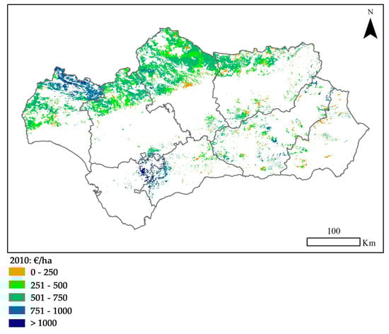 Map of total ecosystem services at producer prices measured by the simplified Agroforestry Accounting System in Andalusian holm oak open woodlands (2010: €/ha). Source: Eloy Almazán based on [,]. Andalusian holm oak woodland surface: 1,408,170 hectares.