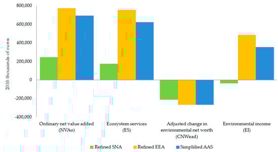 The rSNA incorporates the government institutional sector, and both the rSNA and rEEA extend the variables of the sequence of accounts ([], Table 2, Model C, p. 10), among the most important of which are the ecosystem services (ES), the change in environmental assets (CEA), the adjusted change in environmental net worth (CWead), and the environmental income (EI). The results of the rSNA and rEEA were compared in the same stylized sequence of production and capital accounts with those obtained using the sAAS.