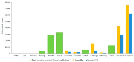 The convention applied in this study, of estimating ecosystem services as the residual economic values embedded in the products generated and consumed by people in the period, excluded the accumulated final natural growth in the stocks of environmental assets at the closing of the period. Thus, it followed that it was not consistent to substitute the physical consumption of woody products for their natural growth in the period in order to estimate the ecosystem services of the woody products. Other authors have preferred to estimate the ES of woody products from the net natural physical growth in the period of the woody products in progress. These authors have explained that this is “in order to avoid misleading overlapping and double counting between the ecosystem service and economic activities already captured by the economic accounts” [] (p. 9).
