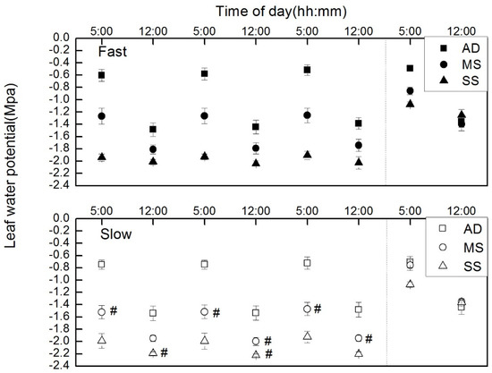 The ψ values of both fast (filled symbol) and slow (empty symbol) genotypes (I-101 (Populus alba L.) × 84K (Populus alba L. × Populus glandulosa Uyeki)) were measured for AD plants, MS plants and SS plants (AD represents control group, MS represents moderately water-stressed, and SS represents severely water-stressed; square for AD plants, circle for MS plants, and triangle for SS plants) at 10, 20 and 30 days after drought treatment (from left to right) and at 15 days (right (behind the dashed line)) after the rewater. The ψpred values were recorded at 05:00, and the ψmidd values were recorded at 12:00. The dashed line denotes the time of watering. Each datapoint represents the mean value (±SE) for six plants. # Indicates data that are significantly different between fast- and slow-growing genotypes under the same treatment.
