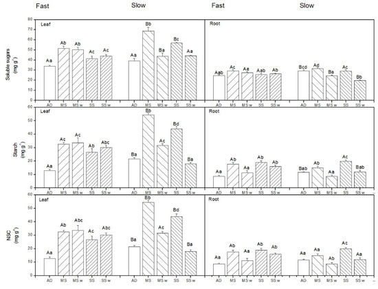 Concentrations of soluble sugars, starch and nonstructural carbohydrate (NSC) in roots and leaves of the two genotypes (I-101 (Populus alba L.) × 84K (Populus alba L. × Populus glandulosa Uyeki)) were taken at the end of the drought and watering. The five pillars on the left of each panel represent the fast group, and those on the right represents the slow group. Letters indicate significant differences (p < 0.05) for a given species and treatment, including AD (control, absence of drought), MS (moderately water-stressed), SS (severely water-stressed), MS rewater (moderately water-stressed plants that were rewatered after drought) and SS rewater (severely water-stressed plants that were rewatered after drought); lowercase is used for single genotype between different sets, and uppercase is used for two genotypes between the same treatment.