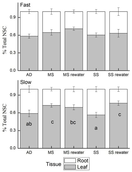 Partitioning of total NSC pool (soluble sugars + starch) across various tissues (leaf and root). Letters indicate significant differences (p < 0.05) for treatments, including AD (control, absence of drought), MS (moderately water-stressed), SS (severely water-stressed), MS rewater (moderately water-stressed plants that were rewatered after drought) and SS rewater (severely water-stressed plants that were rewatered after drought). Error bars represent ± standard error.