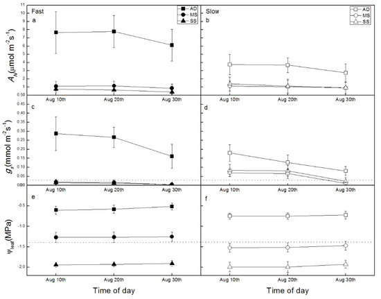 Changes of net photosynthesis (AN) (a,b), stomatal conductance (gs) (c,d) and leaf water potential (ψleaf) (e,f) for fast (filled symbol) and slow genotypes (empty symbol) (I-101 (Populus alba L.) × 84K (Populus alba L. × Populus glandulosa Uyeki)) during August treatment (square for AD plants, circle for MS plants and triangle for SS plants, which represent control plants, moderately water-stressed plants and severely water-stressed plants, respectively). The AN and gs data are means ± SE from four to six fully exposed leaves; ψleaf data are means ± SE of three leaves per treatment.