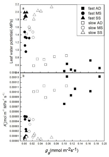 Stomatal conductance (gs) as a function of leaf water potential (ψleaf) (a) and hydraulic conductance (Kh) (b) for control (AD) and stress treatments (MS—moderately water-stressed; SS—severely water-stressed) of fast-growing and slow-growing poplar genotypes (I-101 (Populus alba L.) × 84K (Populus alba L. × Populus glandulosa Uyeki)) after 30 days of water stress. Water potential measurements were conducted immediately after measurements of leaf gas exchange.