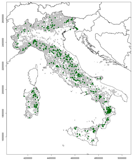 Spatial distribution of all INFC2005 inventory points (all dots) and sampling units which were classified as “Artificial black pine stands” (dark dots) during field activities.