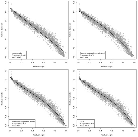 The selection of the best performing model was then based on the underlying physical-biological process (i.e., the expected shape) of the rD–rH relationship as well as the possibility to replicate (i.e., use) the model beyond the compiled dataset and the here-described research work. In order to derive indications on the goodness of fit, the predictions from the four mathematical models were tested by a cross-validation procedure reserving 25% randomly extracted from the database for this purpose. The mean relative absolute error (MAE) and the fraction of explained variance or r-squared (R2) were used as indicators and to test whether the sampling strategy generated fair models with an error below the threshold we used in Equation (1), which was 5%. The random extraction was repeated 1000 times and single-run MAE and R2 values were then averaged to an obtain unbiased estimation of goodness of fit. The best performing model was finally compared with the output from TapeR package [27] an object-oriented tool where more complex equations are implemented, such as the cubic regression models using β-Splines and mixed models, running in R statistical language [29]. The setup we used for the TapeR package was four knots positioned at 0.0, 0.12, 0.75, 1.0 relative heights and a fourth order spline function for fixed effects (cubic). Then, we used three knots positioned at 0.0, 0.1 and 1.0 and a fourth order spline function for random effects (cubic).