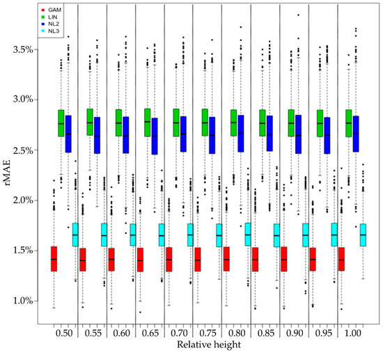MAE of tested models at different relative height along the stem. The boxplots are colored according to the legend in the figure.