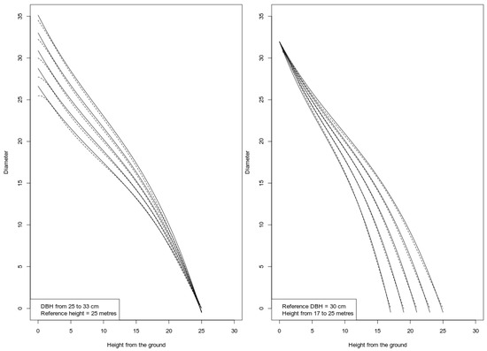 The comparison between the third-order polynomial model estimates and TapeR shows that all the predictions of the simple parametric model were included within the 95% confidence interval provided by TapeR. When plotting the estimates from the two techniques for a simulated tree, no significant differences were apparently found. This comparison is graphically shown in Figure 4 in which the two models were used to simulate the profiles of two hypothetical groups of Pinus nigra stems, one with a fixed height and variable DBH, the other with a fixed DBH and variable height. Indeed, the estimates of the two methods were linearly correlated with highly statistically significant parameters (p < 0.0001, cor = 0.99).