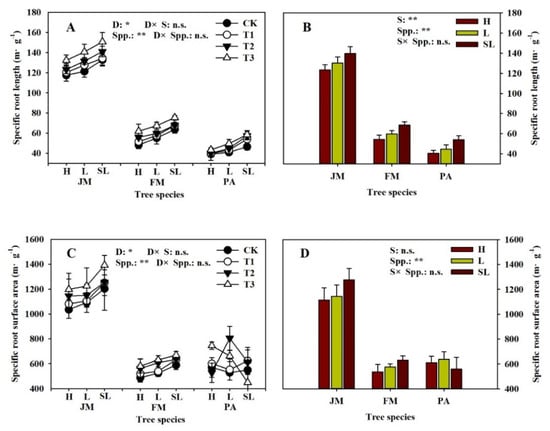 Root tip morphological traits ((A,B) Specific root length; (C,D) Specific root surface area; (E,F) Average diameter; (G,H) Root tissue density) in different drought and soil substrates. The histogram represents the average values across four drought treatments. The error bars represent SEM. H, humus; L, loam; SL, sandy-loam; JM, Juglans mandshurica Maxim.; FM, Fraxinus mandshurica Rupr.; PA, Phellodendron amurense Rupr. CK, control; T1, mild drought; T2, moderate drought; T3, severe drought; n.s. denotes not significant; D, drought stress; S, soil substrates; Spp., species; *, p < 0.05; **, p < 0.01; ***, p < 0.001.