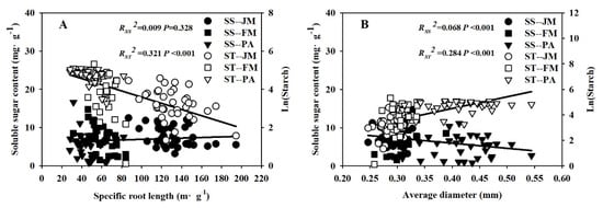 Relationships of the SS and ST concentrations with SRL (A) and AD (B) of root tip in the three specie. SS, soluble sugar (black symbol); ST, starch (white symbol). Data for starch concentration data had undergone ln conversion.
