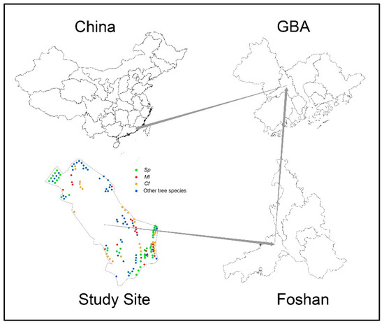 Illustration of study site in Foshan of GBA, China. The green, red and yellow points represent Sp, Ml and Cf, respectively while the blue ones are the other tree species.