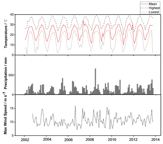 Climate variables, including highest, lowest and mean temperature (°C), precipitation (mm) and max wind speed (m·s−1) were sampled every 10 min with a weather station (WP3103 mesoscale automatic weather station, China) located at an unshaded site approximately 500 m away from the study site. The data were stored in the logger and copied to our laboratory to produce monthly data. For the past decade, with the mean annual precipitation 3416 mm, the rainfall varied monthly and usually reached peaks in summer which could be over 250 mm. Additionally, the mean and the highest temperature in summer was over 28 °C and 35 °C, while in winter the mean and lowest temperature was 13.5 °C and 4.4 °C, which showed a moist and warm environment for trees. The max wind speed fluctuated in different months and ranged from 7.5 to 15.2 m·s−1 generally, which showed a windy circumstance (Figure 2).