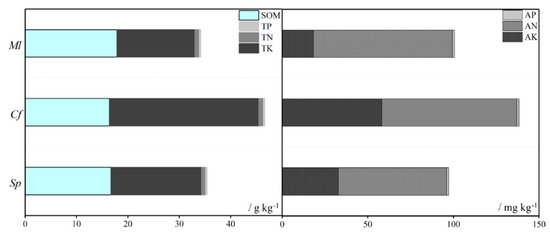 Soil chemical variables including SOM (g·kg−1), TN (g·kg−1), TP (g·kg−1), TK (g·kg−1), AN (mg·kg−1), AP (mg·kg−1) and AK (mg·kg−1) for the three tree species in the overall 0–100 cm layer.