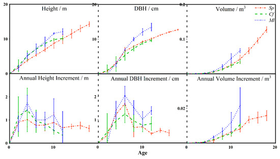 Development of height (m), DBH (cm) and volume (m3) as well as their annual increments of the three tree species (Red: Sp; Green: Cf; Blue: Ml). The panel represents the mean value and error bars indicate standard deviation.