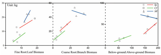 Three types of root:shoot ratio: fine root:leaf biomass ratio, coarse root:branch biomass ratio and below-ground:above-ground biomass ratio. Squares, circles and triangles represent trees of Sp, Cf and Ml and red, green and blue lines are the fitting regressions, respectively.