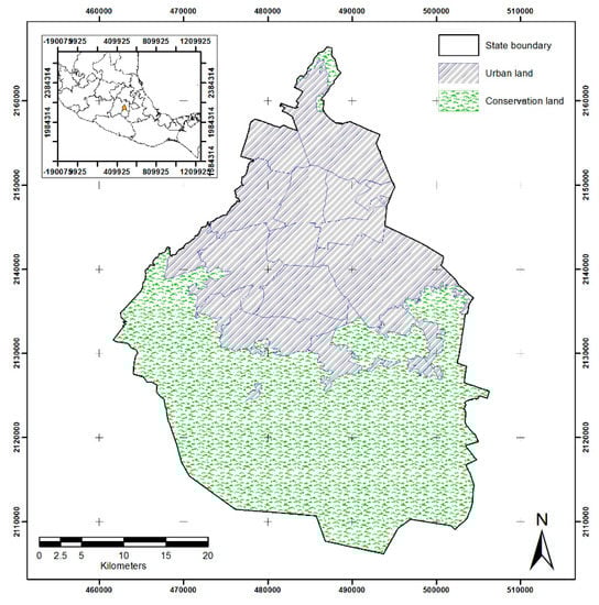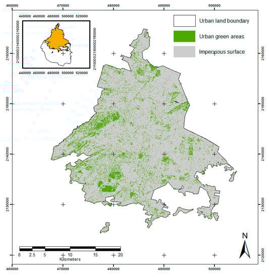 Mexico City’s territory is divided into urban land (UL) with an area of 60,867.9 ha and conservation land (CL) with an area of 87,294.4 ha (Figure 1). This study comprises only UL. Mexico City has 7810 ha of trees (12.8% of the UL area) and 3480 ha of grasses and bushes accounting for 5.7% of this area. A total of 18.5% of the city’s urban area is covered with trees, grasses or bushes [].