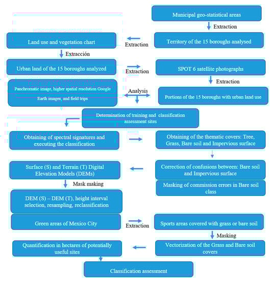 The detection and quantification of potentially useful planting spaces were carried out using supervised classification and masking procedures [,,]. Due to the enormous heterogeneity that characterizes Mexico City, each borough’s territory was analyzed individually in order to reduce the number of contrasting elements that could add confusion to the classification. Through field trips, visual analysis of the satellite images and the coupling of the panchromatic image with higher spatial resolution Google Earth® images [], we determined the points that served as sites for training and validated the precision of the classification process (Figure 2).