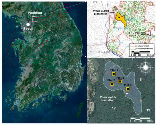 The location of the Pinus rigida plantation in the Forest Technology and Management Research Center in Pocheon and sampling plots of this study.
