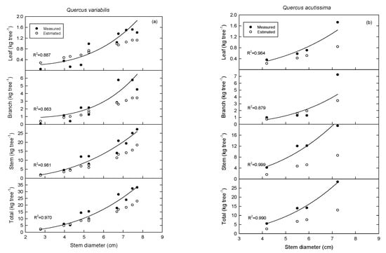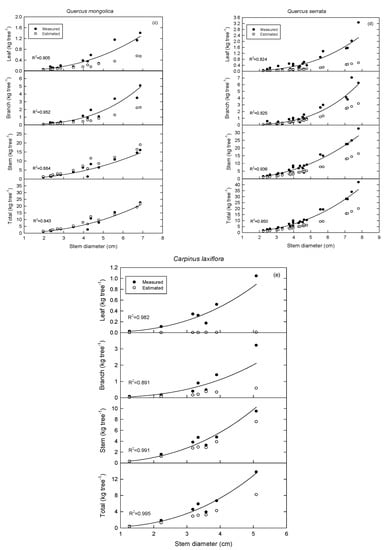 The biomass of each tree part estimated with the regression equation (hereinafter the “estimated value”) was generally lower than the values obtained using the destructive method (hereinafter the “measured value”). However, variations across species and tree parts were observed (Figure 2). The measured values of the foliage and branch biomass of Q. variabilis varied significantly by DBH, such that the stem biomass increased exponentially as the DBH increased (Figure 2a). In the case of branch of Q. acutissima, the measured value was less than the estimated value in the DBH range of 5.5–5.9 cm (Figure 2b). Foliage and branch biomass of Q. mongolica was underestimated, but stem biomass was estimated close to the measured value (Figure 2c). In Q. serrata, the difference between the measured and estimated values of aboveground biomass (foliage, branch, and stem) tended to increase with the increase in the DBH (Figure 2d). Lastly, the estimated value of foliage biomass in the case of C. laxiflora was remarkably lower than the measured value (Figure 2e).