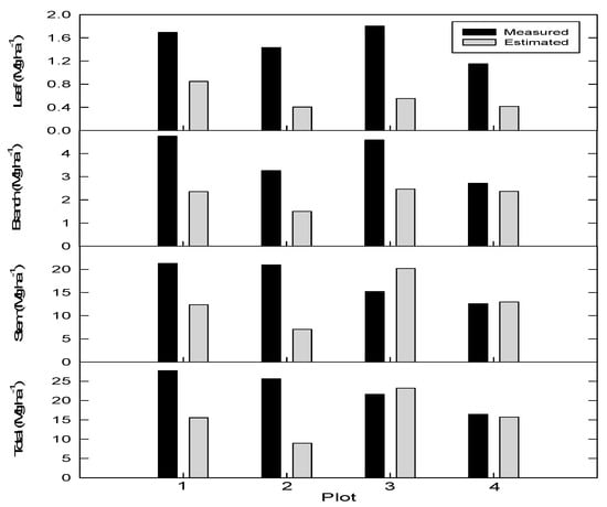 Generally, the biomass estimated with allometric equations were lower than the measured values in all plots (Figure 3), with the mean estimated values for foliage, branch, and stem lower than the mean measured values by 64%, 41%, and 18%, respectively. Specifically, the estimated values for foliage and branch were lower than the measured values in all plots by 50%–72% and 13%–54%, respectively. In the case of the stem, however, whereas the estimated value was lower in plots 2 and 4 by 58% and 34% respectively, it was 33% higher in plot 5.