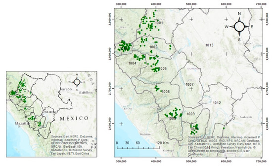 - González-Elizondo, M.S.; González-Elizondo, M.; Márquez-Linares, M.A. Vegetación y Ecorregiones de Durango, 1st ed.; Instituto Politécnico Nacional: México DF, México, 2007. [Google Scholar]