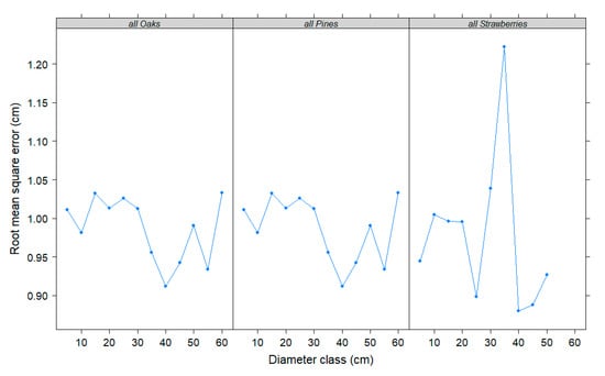In accordance with Huang et al. [50], plots of RMSE were obtained across tree sizes to evaluate the accuracy and precision of diameter predictions of model 2 for the developed equations. Figure 2 shows the plots for the three generic equations developed in this paper (species groups: all pines, all oaks, and all strawberries). It can be inferred that the final equations performed quite well for all sampled diameter classes. All strawberries model produced larger prediction errors for large-sized trees in comparison with all oaks and all pines models.