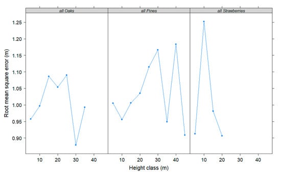 Figure 3 shows the plots of RMSE obtained across tree height classes for the three generic equations developed in this paper to predict total tree height after a 5-year growth period with model 3. It can be seen that the final models performed quite well for all sampled height classes. The prediction errors for the all strawberries equation can be only evaluated for trees less than 25 m in height due to these tree species occupy always the subdominant vertical layers when mature and are small-sized trees [51].