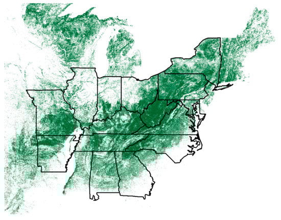Deciduous forests cover roughly 1.2 million square kilometers of the eastern US (Figure 1). They are the predominant type of forest cover, extending from the Piedmont in eastern states such as Virginia, to the Great Plains, and from Gulf states such as Georgia to the Canadian border. Oak–pine forests extend inland from the southern and eastern borders of the region. Oak–hickory forests dominate in the interior, transitioning to maple–beech–birch in the North. The largest areas of contiguous deciduous forests occur along the Appalachian Mountain chain, stretching from northern Georgia and Alabama, then north to New England []. This area includes most of the major eastern deciduous forest groups and the biologically diverse area in central Appalachia known as the mixed mesophytic forest region []. Along with the Ohio River Valley, Appalachia has historically been a center of production for ginseng and off-roots [,,].