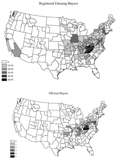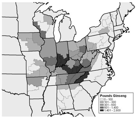 The American Herbal Products Association (AHPA), an industry advocacy organization, collects output data for a number of species commonly harvested from the wild [], but historically they have not documented harvest location or market structure. There are no geospatial harvest distributions recorded for any species other than ginseng, meaning little is known about how wild populations of off-roots are impacted throughout their natural range, and what factors drive harvesting at the local level. Ginseng harvest distributions were studied and mapped in Chamberlain et al. [] (Figure 2). For ginseng, southern and central Appalachia, as well as the Ohio River Valley, were centers of production. Eastern and central Kentucky, western North Carolina, and southern Indiana were the regions with the highest output. Due to the overlapping habitat of many off-root species with ginseng, and the higher value and popularity of ginseng harvesting, it is less likely that buyers would purchase off-roots and not purchase ginseng. A map showing distribution of off-root purchases would then resemble the distribution of ginseng purchasing.