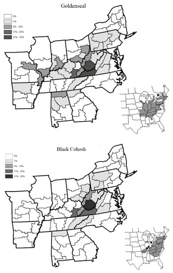Numerous plants and fungi are harvested from eastern United States (US) forests for medicine, food, crafts, and decorative products [,]. Medicinal forest products have been exported from eastern US forests for centuries to supply global consumers, and an estimated 50% of North America’s commercial medicinal forest plant and tree species are native to this ecosystem []. Medicinal plant trade has also played a significant role in regional rural livelihoods, recreation, and cultural identity [,,]. However, with the exception of American ginseng (Panax quinquefolius L.), which is regulated under the 1974 Convention on International Trade in Endangered Species of Wild Fauna and Flora (CITES), little is known about how raw material trade varies across species and throughout the region []. A lack of such data inhibits the effective management of medicinal non-timber forest products (NTFPs) because little is known about what is harvested and from where, as well as the associated market value.