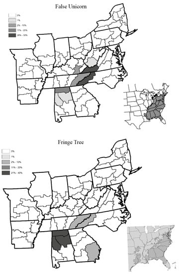Heat maps depicting trade volumes for false unicorn (top) and fringe tree bark (bottom) across 15 states in the eastern US in 2015, represented in percent of total harvest by USFS FIA unit. Darker colors indicate greater percent of overall trade. Range maps from eFloras (false unicorn) and the US Department of Agriculture (fringe tree) [,].