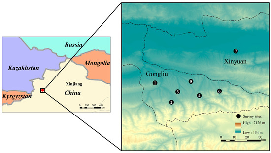 Location of survey sites in Yili River Valley of Xinjiang Uyghur Autonomous Region, China. The symbols in the map indicate the seven survey sites in the Yili River valley (1: Erxiang; 2: Damohe; 3: Xiaomohe; 4: Balian; 5: Jiaolesai; 6: Saha; and 7: Xinyuan).