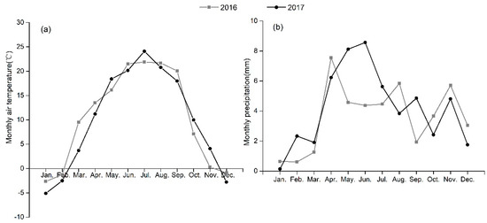 Monthly air temperature (a) and precipitation (b) in 2016 and 2017 in Xinyuan county of Yili River Valley in Xinjiang Uyghur Autonomous Region, China. Data were recorded in a local meteorological station in Xinyuan County.