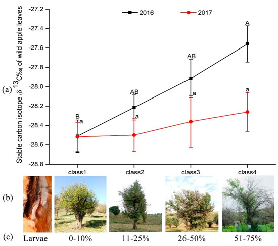 It is worth noting that the change in δ13C showed a similar trend among damage rankings in both years. There was a significant difference among rankings in 2016, which had a drier late winter and growing season. In contrast, the values of δ13C were not significantly different among damage rankings in 2017, the year with higher precipitation in late winter and during the growing season. The values of δ13C in the same damage ranking were significantly different between 2016 and 2017. Such correlation between δ13C and precipitation has also been demonstrated in other studies [33,34,35], suggesting higher stomatal conductance in moister environments. Similar confluent and sequential stresses were also reported as potential causes for the decline of Atlas cedar [36] and cultivated apple trees showing symptoms of “rapid apple decline” in North America [37]. Our study also implies that pest infestation aggravated the decline in WUE, especially in drought conditions. The health status of wild apple forests in 2016 was much better than that in 2017, indicating that higher precipitation might alleviate the pest pressure. However, the interactive influence of pest infestation and water availability on WUE of wild apples should be examined under controlled treatments.