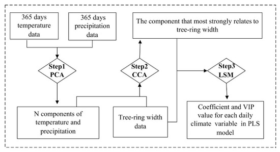 Framework of implementing Partial Least Square Regression (PLS) based on daily temperature and precipitation data and tree-ring widths of pine trees. N = total number of observations. PCA (principal component analysis) is used to remove the collinearity among daily temperature and precipitation data. CCA (canonical correlation analysis) was used to find the components that most strongly relate to tree-ring width. LSM (least squares method) was used for parameter estimation in the PLS model. VIP (variable importance in the projection) was used to judge the importance of each variable.
