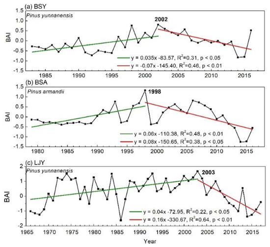 Change trends in the normalized basal area increments (BAI) of Pinus yunnanensis (102 cores) at BSY (a) and LJY (c) and Pinus armandii (103 cores) at BSA (b) in Baoshan and Lijiang, Yunnan, southwest China. BSY = (Baoshan yunnanensis) site where P. yunnanensis samples were collected in Baoshan. BYA = (Baoshan armandii) site where P. armandii samples were collected in Baoshan. LJY = (Lijang yunnanensis) site where P. yunnanensis samples were collected in Lijiang.