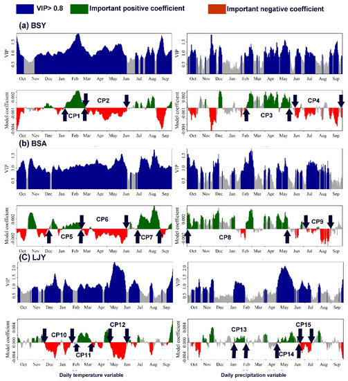 To interpret the results of PLS regression, we mainly considered the overall impact of multiple continuous independent variables (a continuous period) on the dependent variable, rather than the effect of a single independent variable on the dependent variable. For example, in the case that all or most of the standardized coefficients of continuous daily climate observations are positive or negative, and the average VIP for those days exceeds 0.8; we consider this a critical climate period (CP) for tree growth.