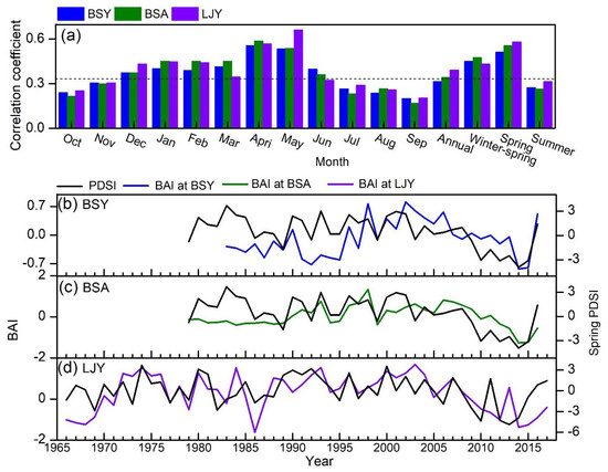 The relationship between tree-ring widths and Palmer Drought Severity Index (PDSI) and correlation coefficients between tree-ring widths of Pinus yunnanensis and Pinus armandii and PDSI, horizontal dashed line denotes the 99% confidence intervals (a); Long-term variability of spring PDSI and normalized basal area increment (BAI) of P. yunnanensis (b and d) and P. armandii (c) in Baoshan and Lijiang, Yunnan, southwest China. BSY = (Baoshan yunnanensis) site where P. yunnanensis samples were collected in Baoshan. BYA = (Baoshan armandii) site where P. armandii samples were collected in Baoshan. LJY = (Lijang yunnanensis) site where P. yunnanensis samples were collected in Lijiang.