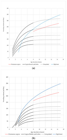 In order to objectively compare the economic efficiency of coppice and high forest or over-mature coppice, it was necessary to employ models but with the use of actually achieved prices of silvicultural and felling operations and actual exercise prices of timber. The rotation period of 150 or 40 years used in the area was employed in the case of high forest and over-mature coppice. The net present value with the interest rate of 1% and 2% was calculated, as well as the difference between costs and revenues for the period of 150 years. The rotation period of 150 years was used in options 1 through 4. Options 5 through 6 (coppice) were calculated with the rotation period of 37.5 years (4 × 37.5 years = 150 years of a high forest). Forest growth tables were used in the case of coppice forests as there are currently no coppices managed in the area of LP Křivoklátsko. The tables were analyzed for their compliance with the figures of actually achieved over-mature coppice stock in the area of LP Křivoklátsko to assess their appropriateness for the application to oak coppice. Therefore, the values of hectare growing stock of over-mature coppice were classified according to the scale of available coppice tables (e.g., References [16,17]). Since the tables only include values of stocks with the stand age of up to 80, the curves of the individual site indexes in the respective tables were extrapolated as you can see in Figure 2. The extrapolation was performed using the generalized Chapman–Richards function [18], as in Formula (2):