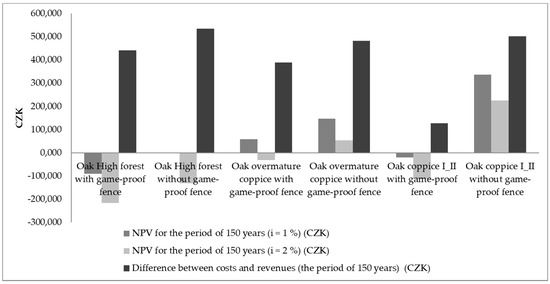 Another economically interesting alternative could be the cultivation of over-mature coppices. The biggest advantage, in this case, is the very low costs on establishing new stands. Only the option with game-proof fence and i = 2% reached a negative level (−31,267 CZK/ha). The difference between costs and revenues in the case of the option without game-proof fence is 483,138 CZK/ha. The calculations for high forests involving the time factor generally reached negative values. This was mainly due to the high initial costs of establishment and potential protection of the new stand as well as due to the relatively long rotation periods (150 years in the case of the examined options). Both options of high oak forest cultivation (with and without game-proof fence) reached negative values, with both i = 1% and i = 2%. In the case of the option with game-proof fence, the revenues less the costs are 441,694 CZK/ha, while without game-proof fence, they are 535,430 CZK/ha.