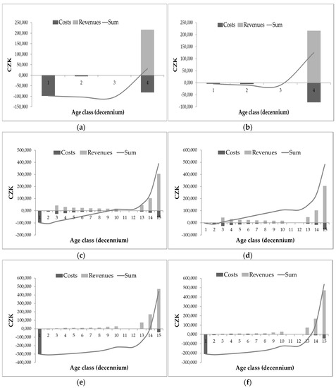 Figure 4a–f shows the courses of costs and revenues for the entire rotation period for the individual examined options (without taking into account the time factor). The point where the curve of the sum of revenues and costs since the stand establishment intersects the x-axis shows the age of the stand at which the costs and revenues are balanced. A stand starts to be profitable at that point.