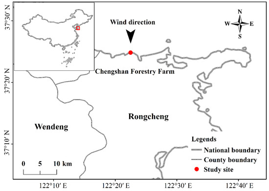 The Japanese Black Pine, Pinus thunbergii Parl., native of eastern Asia, is adapted to coastal high salt and windy environments [23,24]. Our experimental site is located at Chengshan Forestry Farm (122.31° E, 37.23° N) in Shandong Province (Figure 1). The farm has 833 ha of pure P. thunbergii plantation with homogeneous age (60-year) and density (2 × 2 m) in coastal flat beach. The study area has a continental monsoon climate with average annual temperature of 11.4 °C and average annual precipitation of 793.2 mm. The prevailing wind direction is north, and soil type is infertile sandy soil.