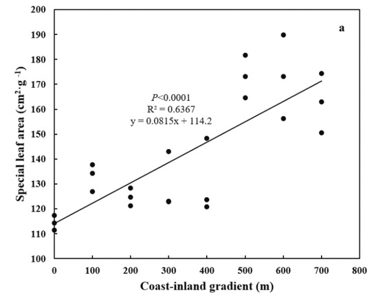 Variations in leaf morphology for P. thunbergii along the coast-inland gradient. (a) Special leaf area (SLA), and (b) Leaf thickness.