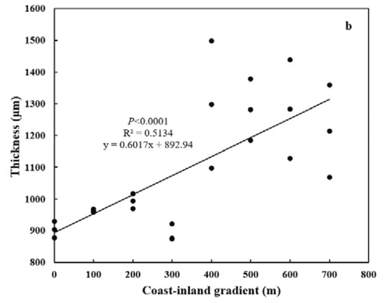 Variations in leaf anatomy for P. thunbergii along the coast-inland gradient. (a) Epidermal thickness, and (b) Cuticle thickness.
