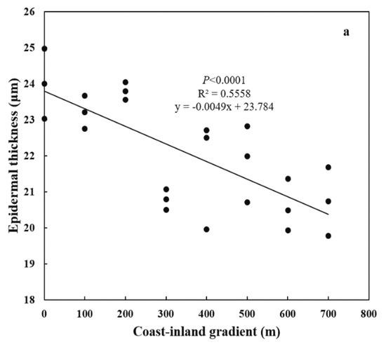 Both special leaf area (SLA) and needle thickness increased (p < 0.0001) from coast (11.44 ± 0.02 cm2 g−1, 890.47 ± 26.42 μm) to inland (17.31 ± 0.038 cm2 g−1, 1298.17 ± 200.21 μm) (Figure 4a,b). Meanwhile, both epidermal thickness and cuticle thickness decreased (p < 0.0001) from 24.00 ± 0.025 μm and 5.16 ± 0.38 μm to 20.59 ± 0.874 μm and 3.49 ± 0.44 μm, respectively (Figure 5a,b). Needle thickness was negatively, while cuticle thickness was positively, related to SC/NSC (p < 0.01) (Figure 6a,b).
