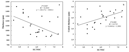 The relationships between leaf carbohydrate categories and morphology and anatomy for P. thunbergii along the coast-inland gradient. (a) Leaf thickness and SC/NSC, and (b) Cuticle thickness and SC/NSC.