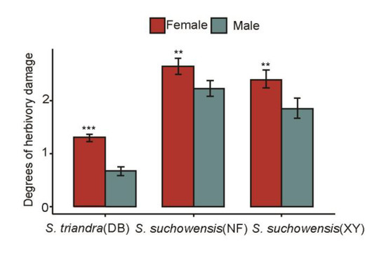 Herbivory may play an important role in the evolution of plant reproductive systems. Male-biased herbivory appears to be the most common pattern [9,13]. However, some papers documented female-biased herbivory [15], suggesting that male-biased herbivory might not be universal. This finding is consistent with our findings, which showed that female plants have more serious insect herbivory than male trees. The effects of plant gender on herbivory rates might be related to environmental conditions (soil moisture and nutrition) and populations. Damage of S. suchowensis was much more severe than that of S. triandra. Herbivores may be affected by plant growth characteristics, such as biomass, number of branches, and arrangement of leaves [45]. An increase in above-ground biomass, number of leaves and stems, and sizes of leaves may lead to an increase in sensitivity to insect herbivory [17]. We found a positive correlation between plant biomass and insect herbivory in S. suchowensis and S. triandra. Plant individuals with large biomass or more vigorous growth may be more conducive to insect spawning, foraging, and survival.