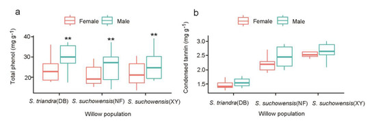 Thirty individuals (fifteen males and fifteen females) were selected from each willow population, and the young leaves of willow trees were selected as materials at the end of September 2018. The leaves were oven-dried at 50 °C and weighed to the nearest 0.01 mg. The samples were then ground in a ball mill and analyzed colorimetrically for phenolic compounds and tannins.