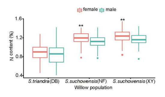 Contents of N in leaves of willow plants. Notes: Comparisons between females and males within leaf N content (N) were performed using the pairwise t-test. ** p < 0.01. Filled dots represent outliers.